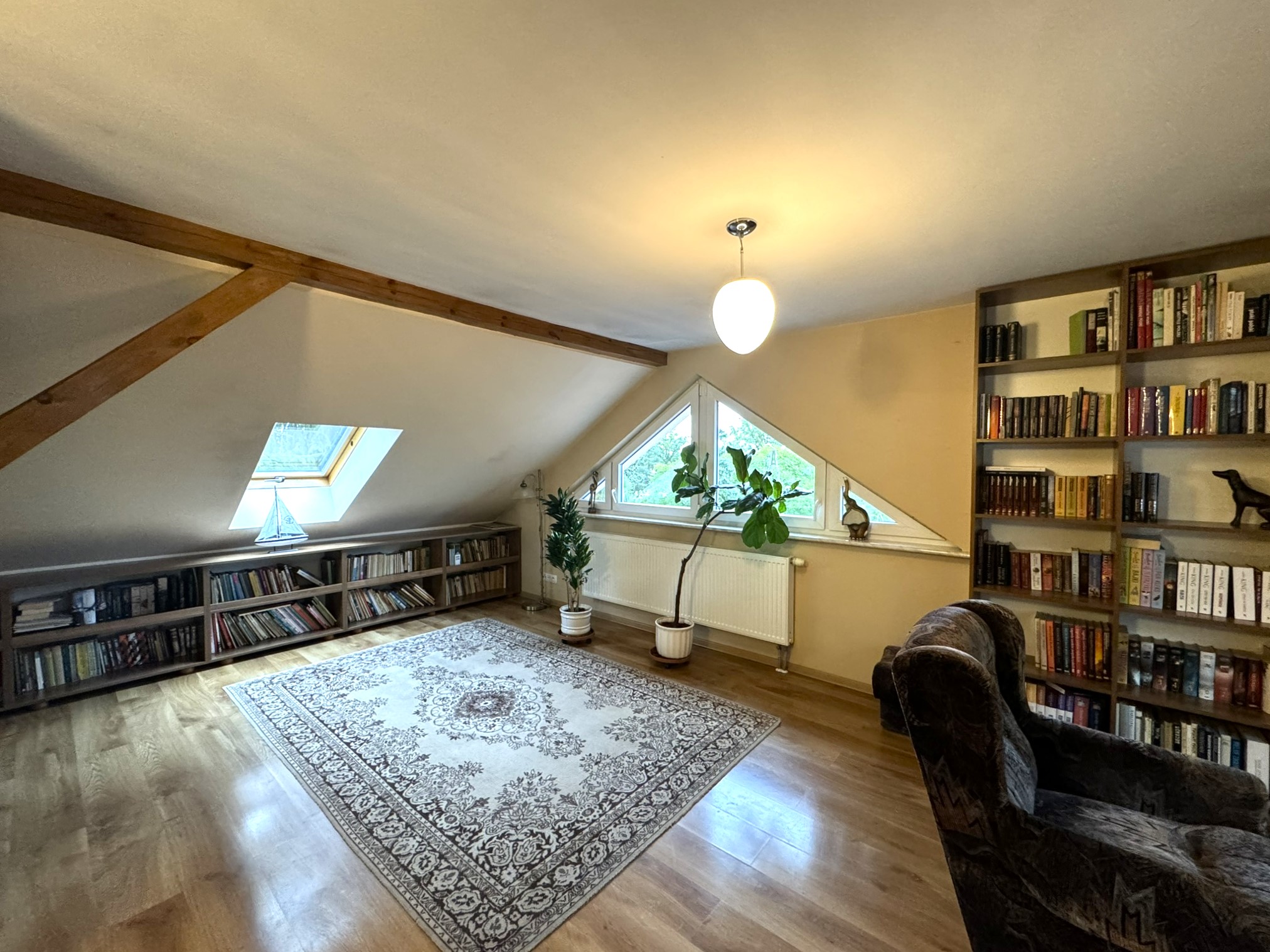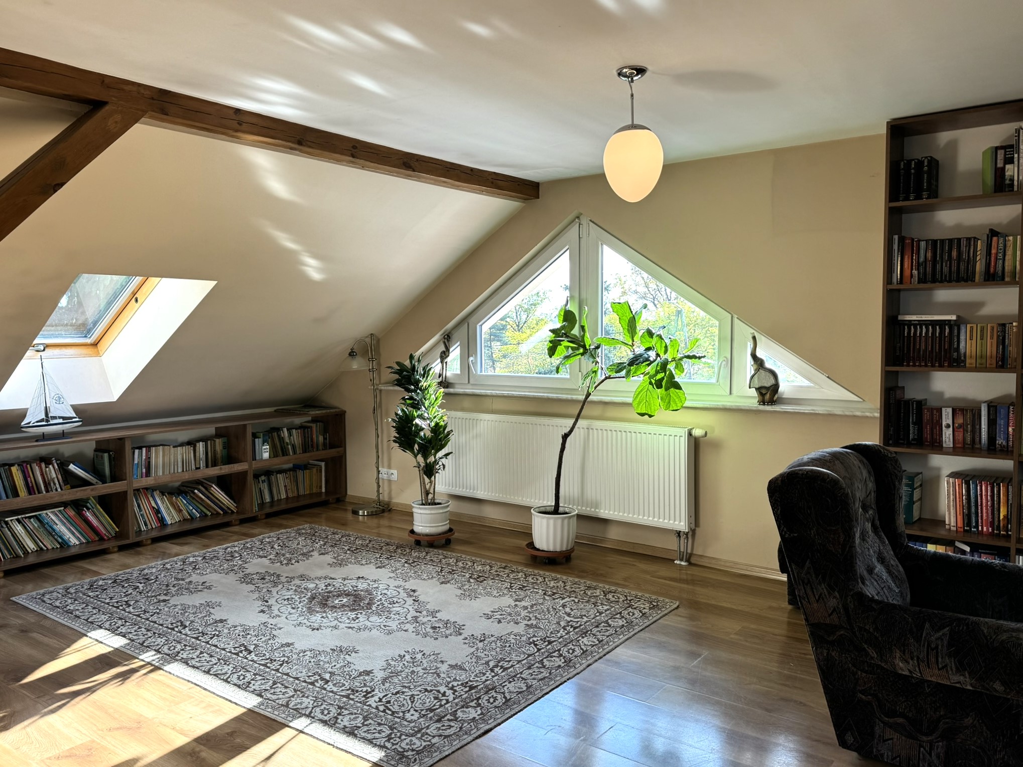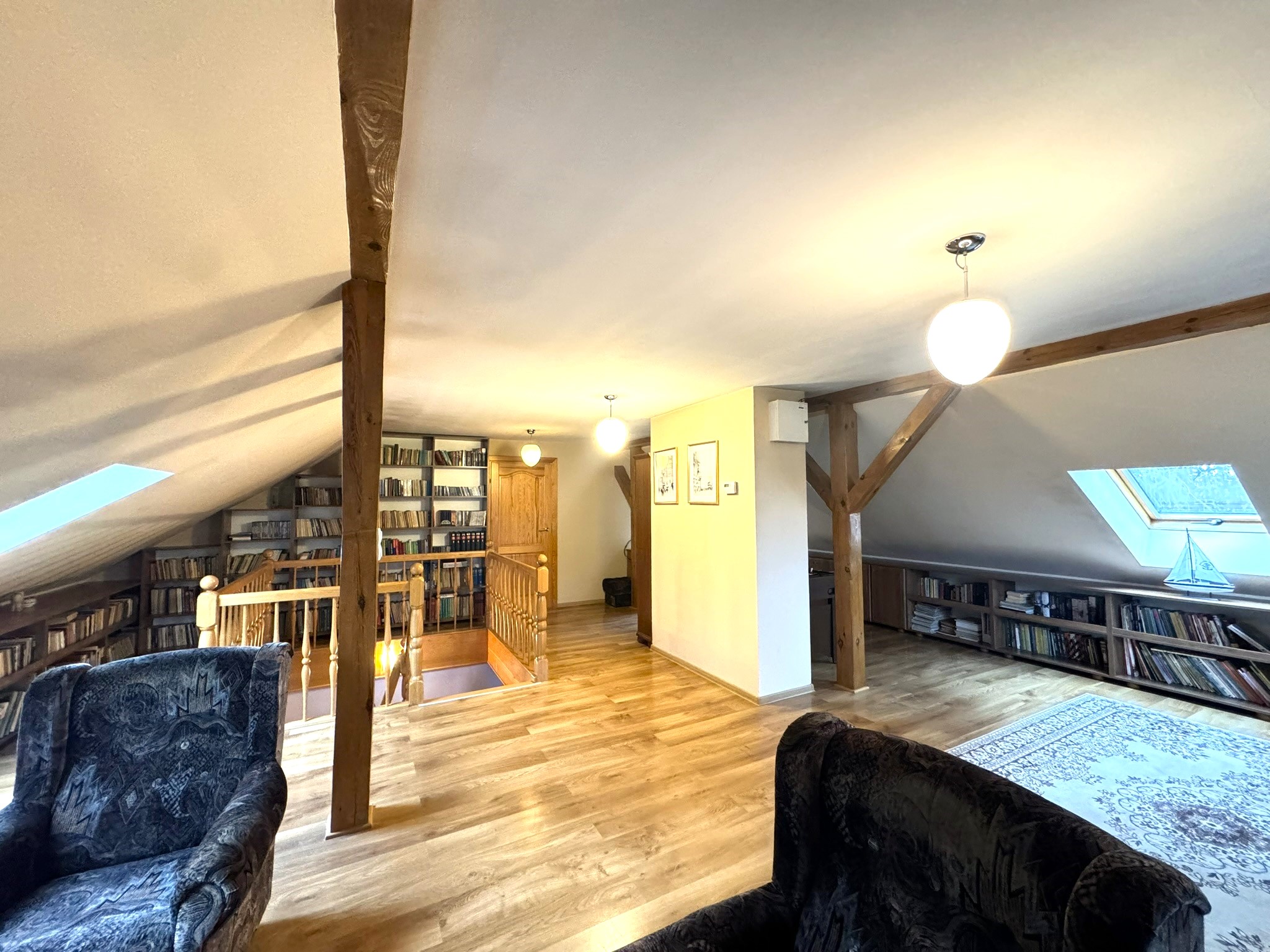 duża antresola zaadaptowana na bibliotekę, z miejscem do czytania i wypoczynku.