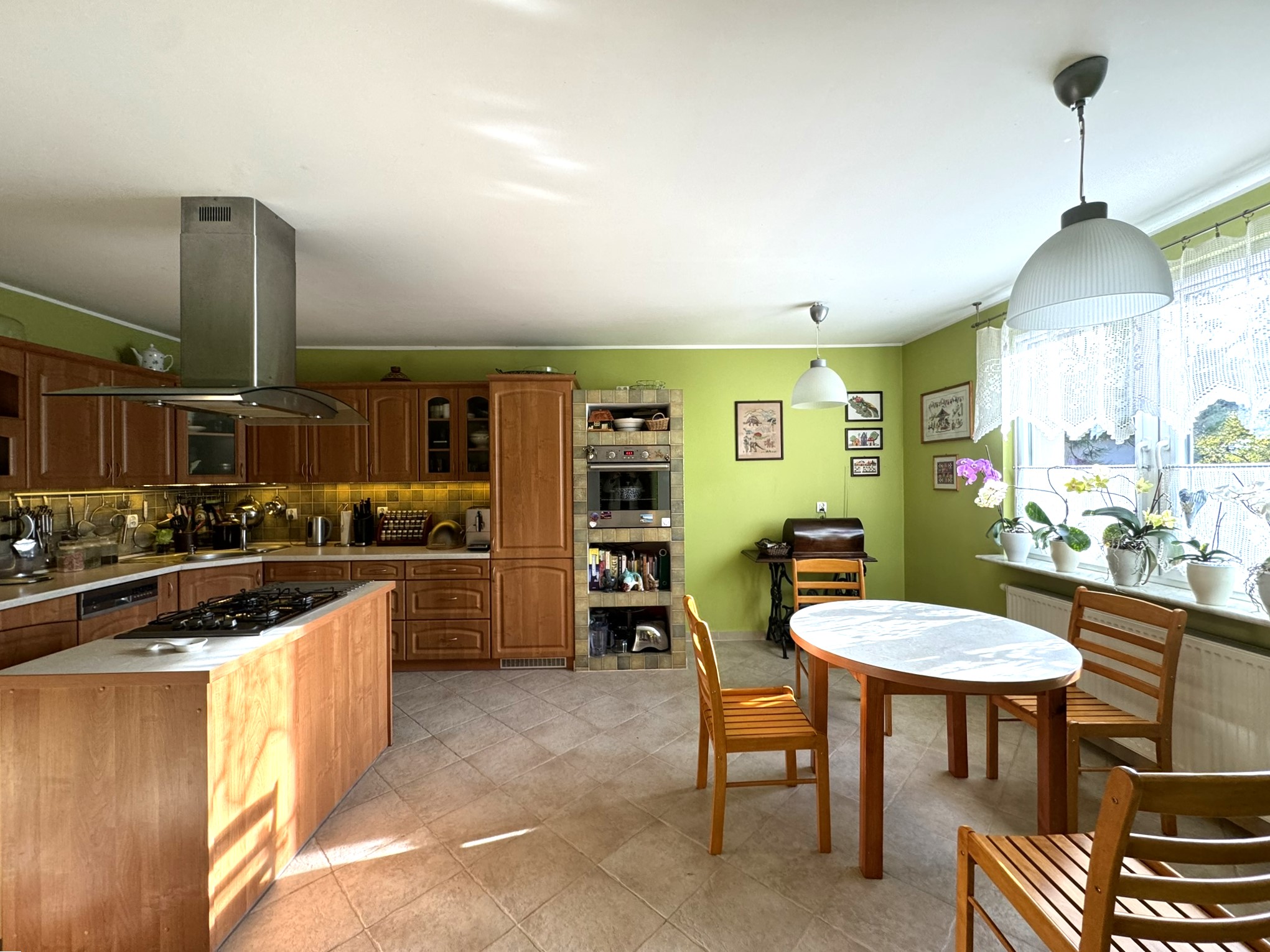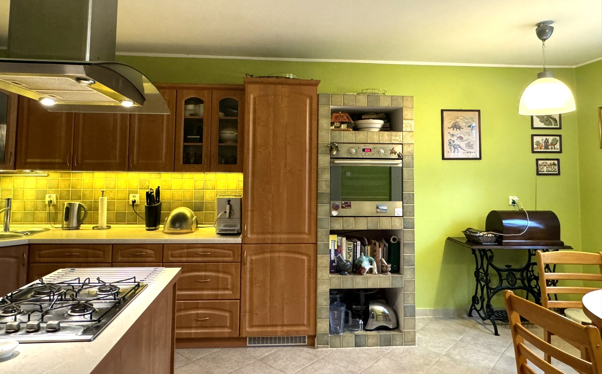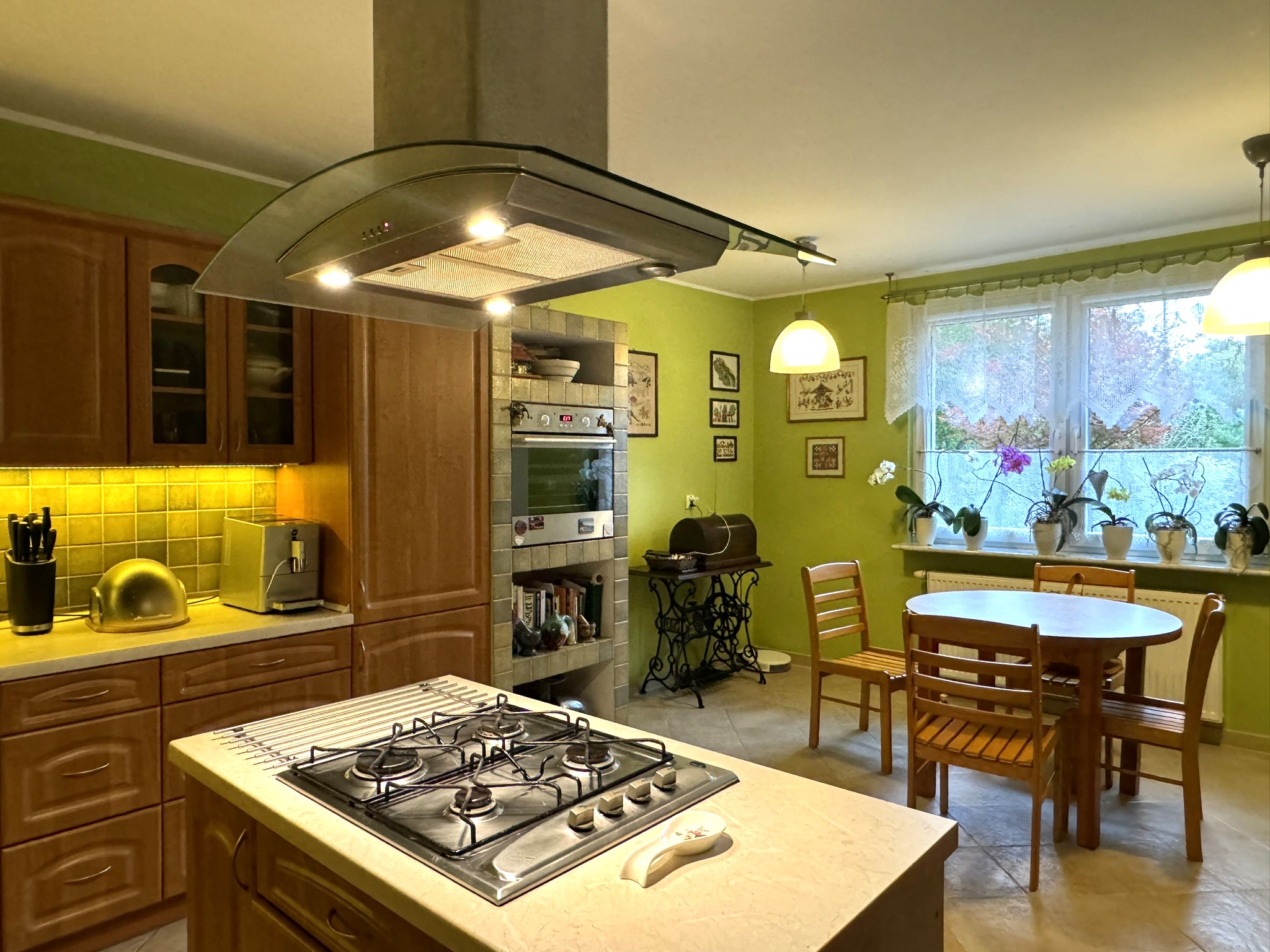 kuchnia – meble w zabudowie na wymiar wraz z sprzętem AGD – zmywarka, okap, lodówka, piekarnik, płyta grzewcza gazowa, sprawny piec kuchenny.